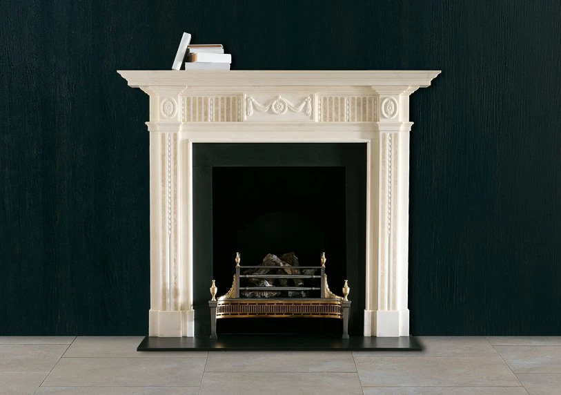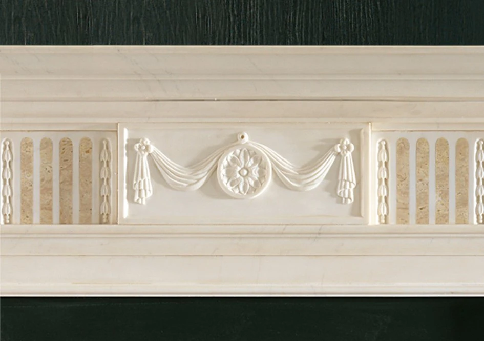 A neo-classical chimneypiece in statuary marble with carved centre tablet and corner blockings. The jambs and frieze panels are inlaid with Etruscan gold marble.