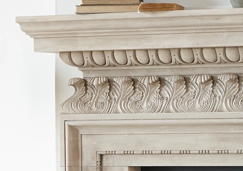 A mid 18th century chimneypiece with moulded dog leg jambs, a repeat frieze carved with stiff leaf acanthus and a corniced shelf featuring a tier of crisp egg and dart carving. It is shown here in an optional bespoke antique finish with slate hearth and slips and Osterley steel fire basket.