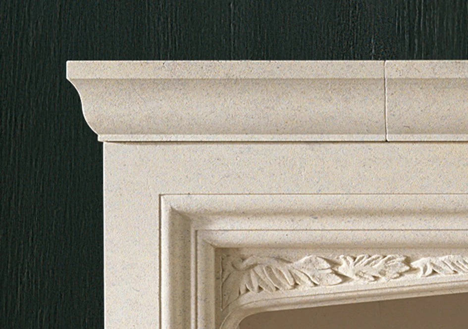 A stone chimneypiece in the Tudor style with foliate carving to the spandrels. Shown here in English Bathstone. Please note: The standard production material for this fire surround is Bianco Avorio priced as indicated.