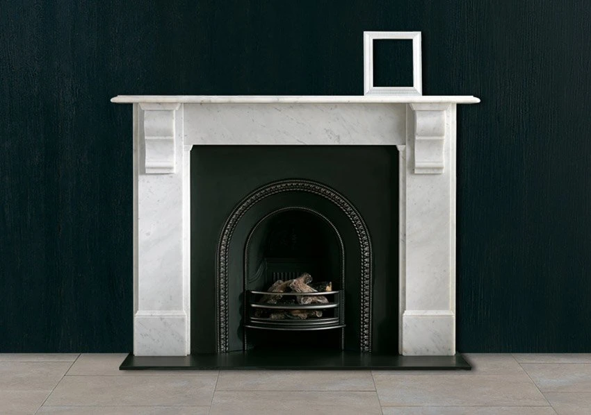 A popular late 19th century design with plain jambs and frieze and simple moulded corbel supporting a generous mantel shelf, shown here in Carrara marble. Also available in Volakas marble.