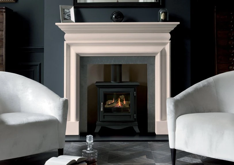 With its simple lines and generous curves The Elemental Clandon is a versatile design that is suitable for both traditional and contemporary interiors. Fabricated in Portuguese limestone, it is shown here with Chesneys’ Beaumont gas stove.