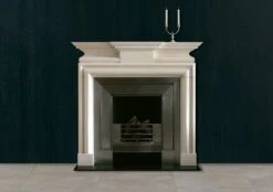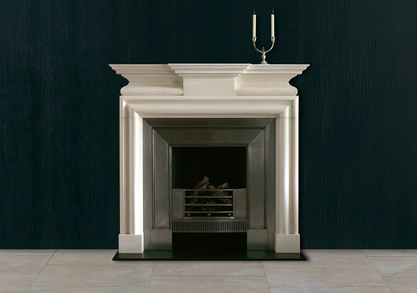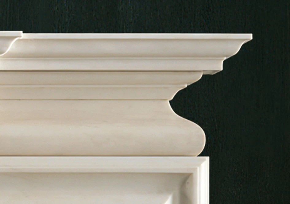 A mid 18th century chimneypiece in statuary marble with breakfront corniced shelf and incorporating a bolection moulding framing the aperture beneath a semi barrel frieze with plain projecting centre tablet.