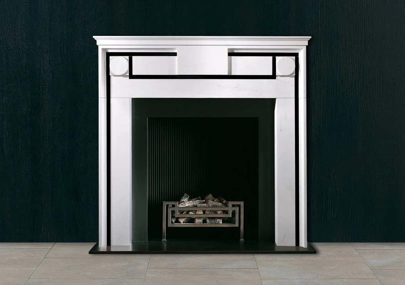 One of Lutyens most unusual designs shown in statuary marble with inlaid Bruxelles Noir marble framing a central tablet and raised discs at the head of the jambs.
