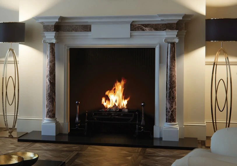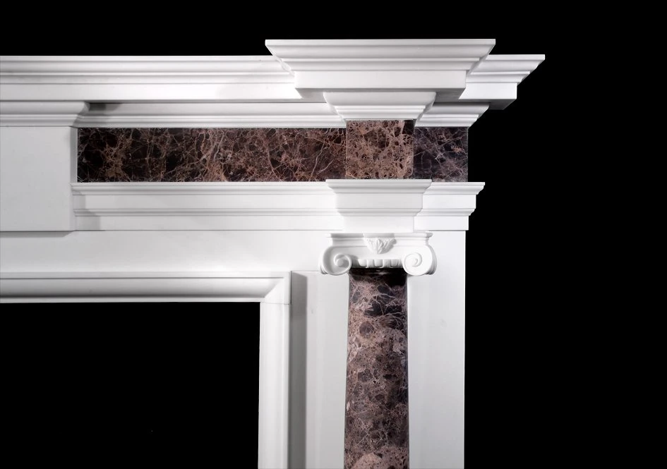A chimneypiece of classical form with detached columns terminating in ionic capitals shown in statuary marble with Dark Emperador columns and frieze.