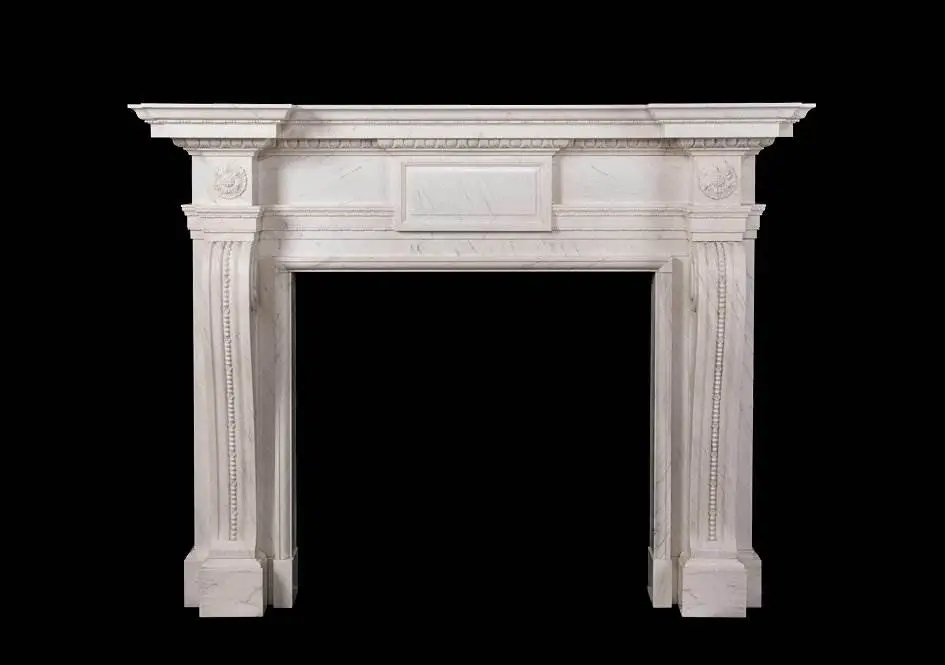 A mid 18th century design of chimneypiece with robust console jambs beneath corner blocks carved with rosette, the frieze plain with a projecting central tablet beneath a carved breakfront shelf.