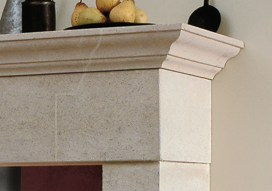 An 18th century Provincial French design of simple form with console jambs, plain frieze and generous mantel shelf. This is a design seen in chateaux and manor houses throughout France. Manufactured in Bianco Avorio limestone to replicate the rough textured and warm coloured stone used in original examples.