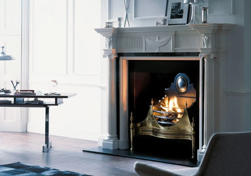 An 18th century neo-classical chimneypiece which shows the influence of Robert Adam. It has fluted Ionic columns supporting an entablature decorated with classical urns and ewers with inset marble panels in contrasting colours to the statuary marble.