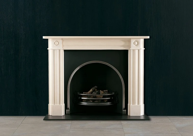 An English stone chimneypiece of early 19th century design, having moulded jambs and frieze with bullseyes to the capitals. Available in standard and large sizes.