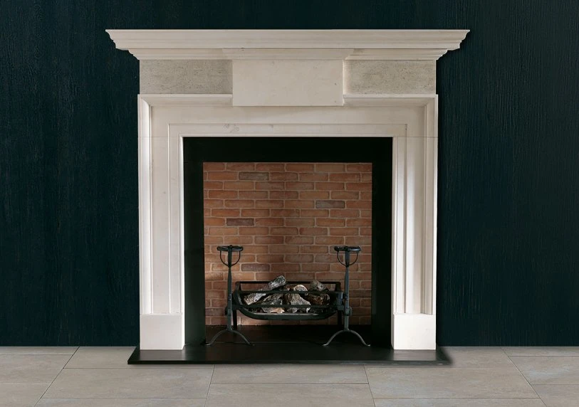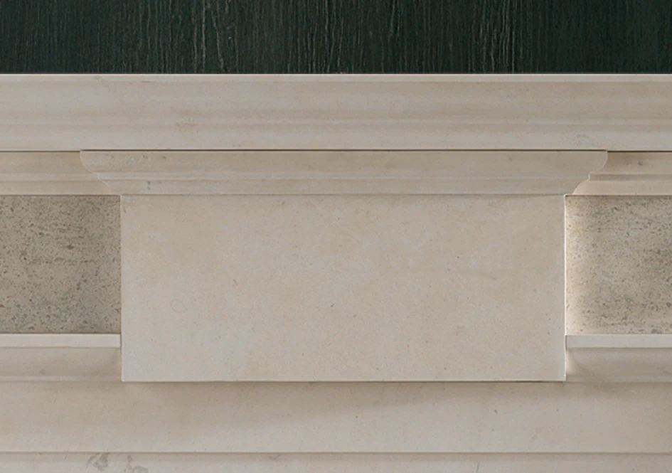 An impressive late 18th century Limestone chimneypiece of strong architectural form with crisply executed mouldings to the shelf and ingrounds and a plain projecting centre tablet.