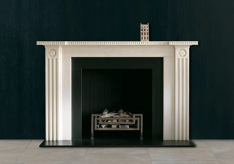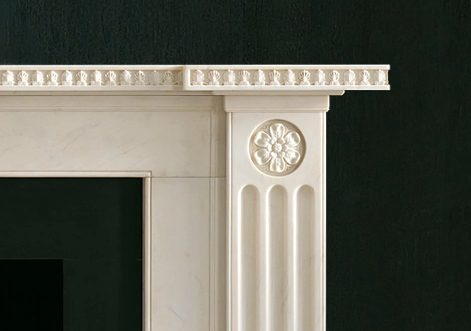 In statuary marble. A design that exemplifies Soaneβs unique ability to re-work traditional classic motifs in new and original forms. The chimneypiece has a breakfront shelf carved with anthemion above pilasters headed by finely carved rosettes above deeply incised stop flutes.