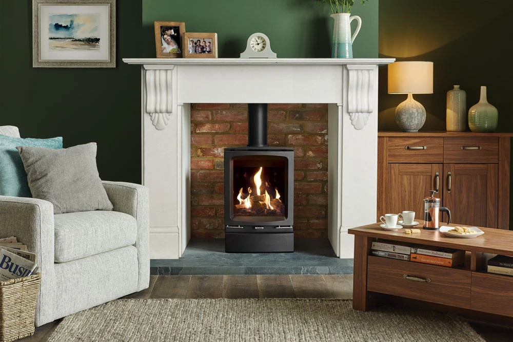 Creating breathtaking flame visuals, Vogue Gas stoves feature a highly realistic log bed and a polished EchoFlame Black Glass lining that provides a stunning, multi-sided reflection of the flames. Designed with the very latest gas fire technology, these cutting edge stoves provide an ample 4.3kW of heat at 84% efficiency.