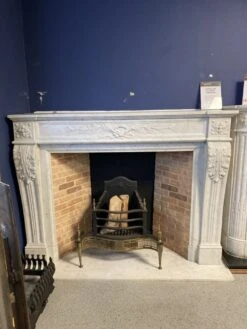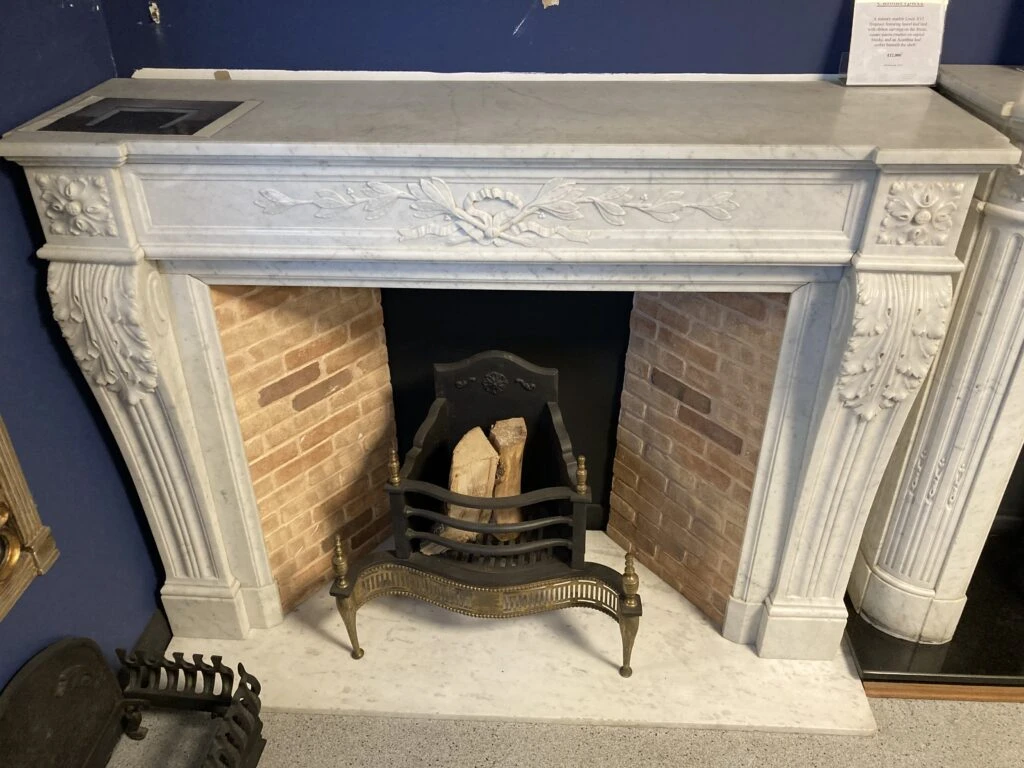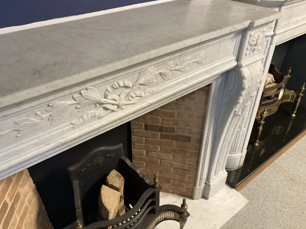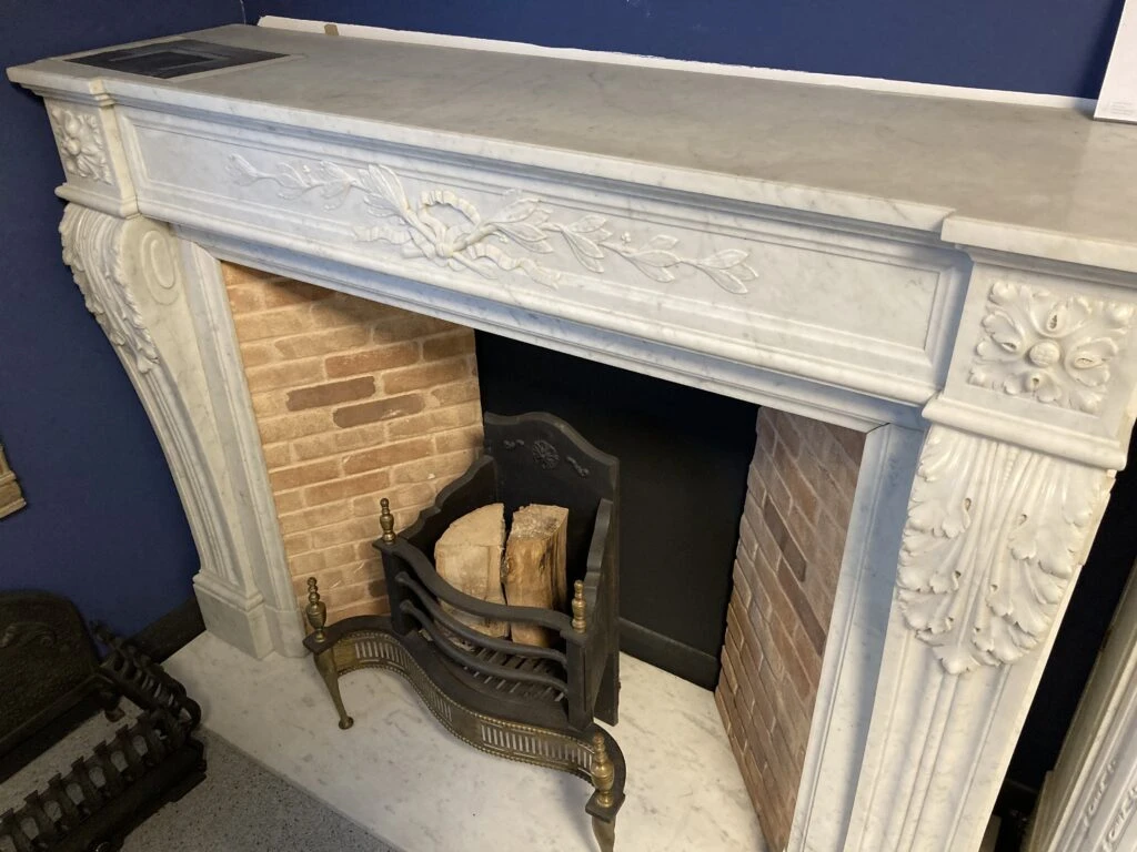 A statuary marble Louis XVI firplace featuring laurel leaf tied with ribbon carvings on the freiz, square patera rosettes on capital blocks and an Acanthus leaf corbel beneath the shelf.