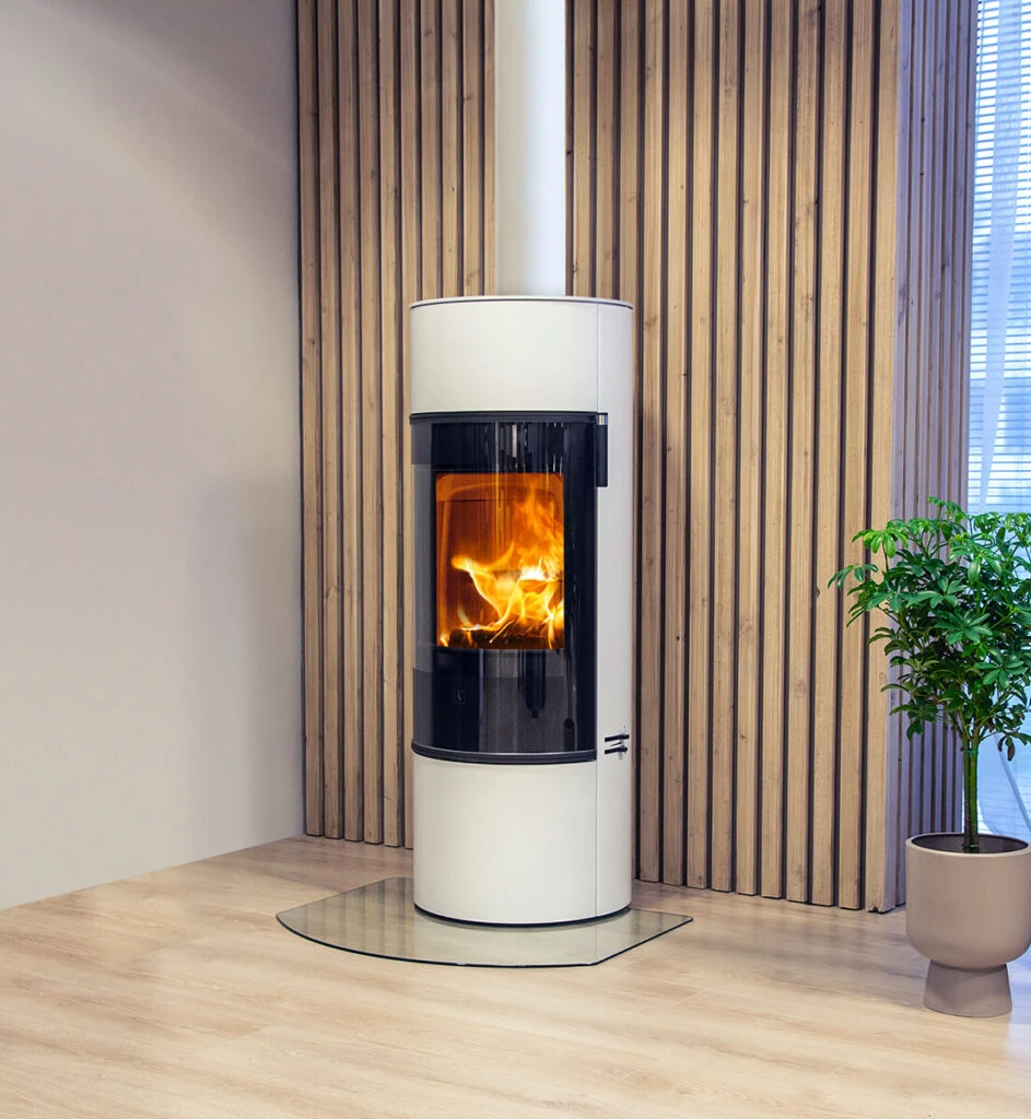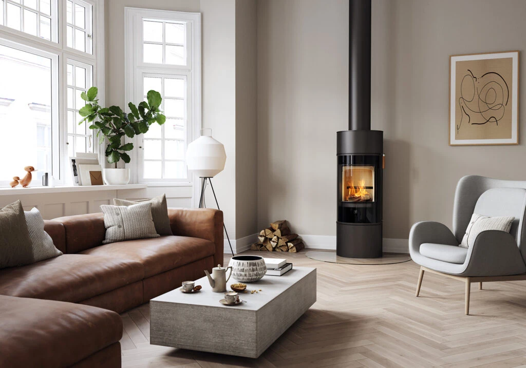The Scan 84 series has clean lines and an almost architectural design – playful, yet discreet. The series consists of 4 models, where the variations are in the choice between two different heights and a door in exquisite black glass or steel surface. The door has a soft-close function that ensures that it closes softly and quiet. A decorative plate for the of the stove (accessory) combines the rough steel in a beautiful way with inviting and elegant black glass or soapstone.
