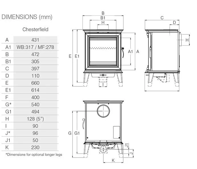 This wood burning and multi-fuel stove is available in a wider format: the Chesterfield 5 Wide in a MF version only.